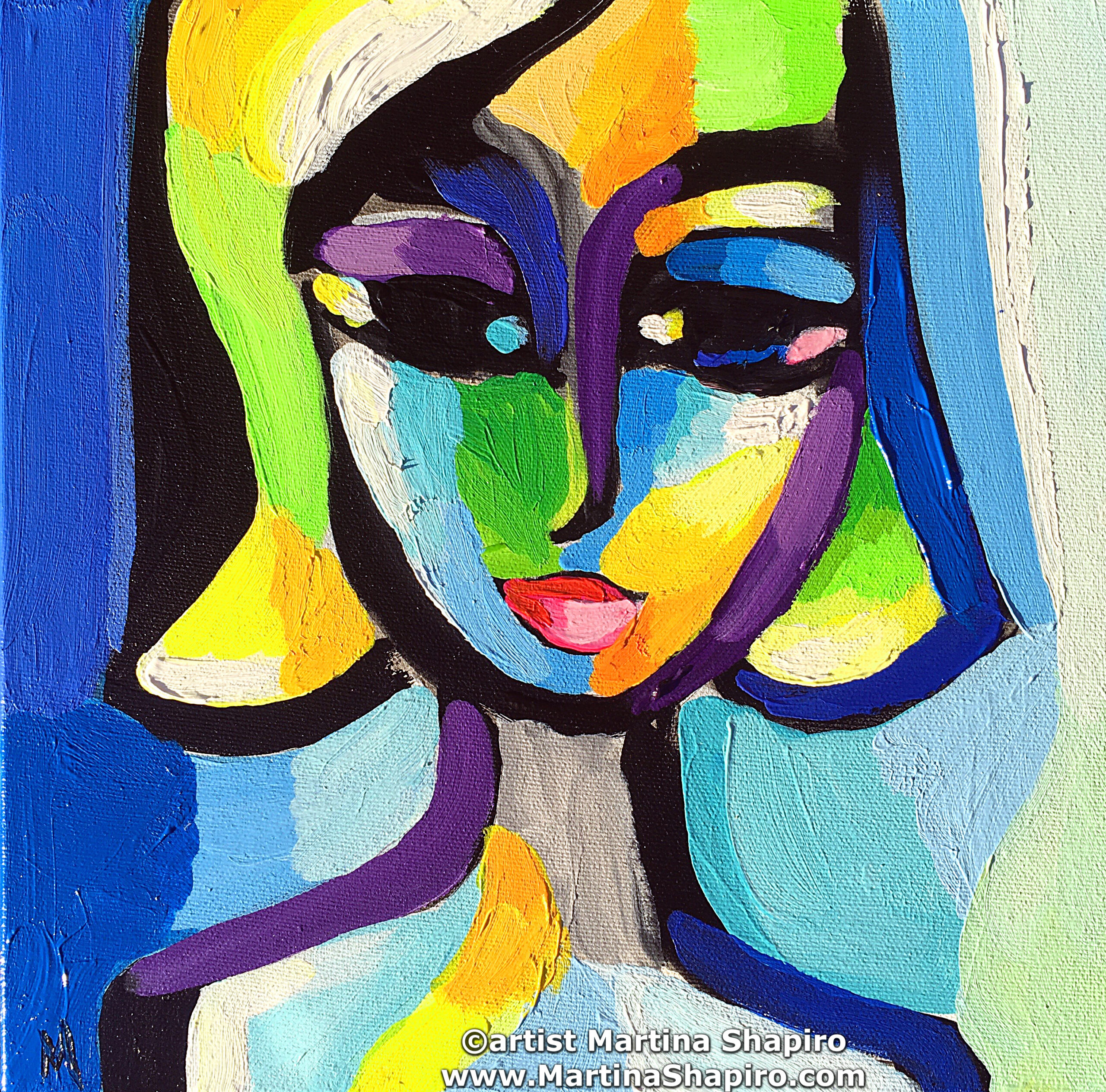 Abstract Fauve portrait of a girl in blue, yellow, purple, green, turquoise, and other saturated colours. The source description emphasizes the rich contrasts and shifting hues that change with different kinds of light.