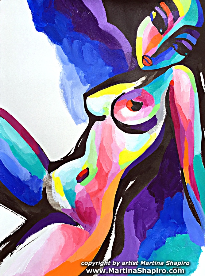 Relaxed but confident reclining nude in blue and purple Fauve colour. The source description emphasizes the expressive ink line, bright acrylic surface, visible paper texture, and the framing requirement that comes with the work being sold unframed.